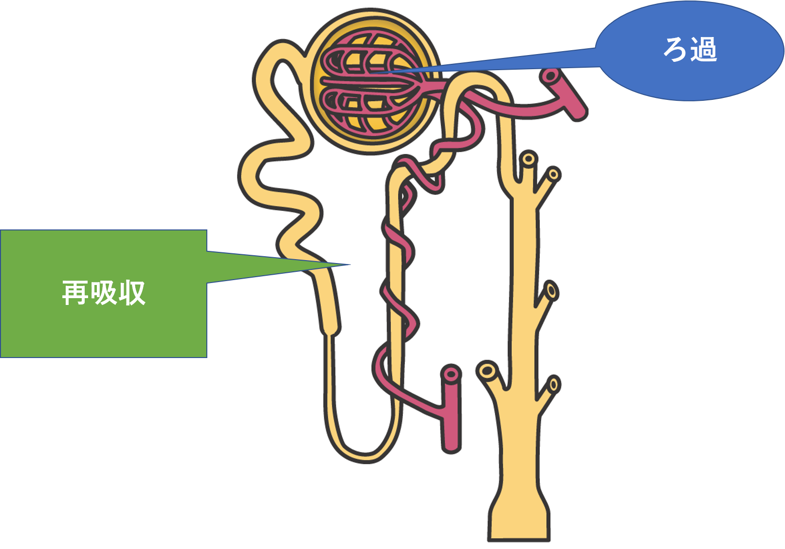 血糖はやがて、腎臓にたどり着き、フィルターの役割をしている糸球体でろ過されます。そもそも糖分は私たちの重要なエネルギー源であるため、このまま尿中にすべて捨ててしまってはもったいないです。そのため、糸球体でろ過された後は、尿細管で大部分が再吸収されて血液中に戻っていきます。