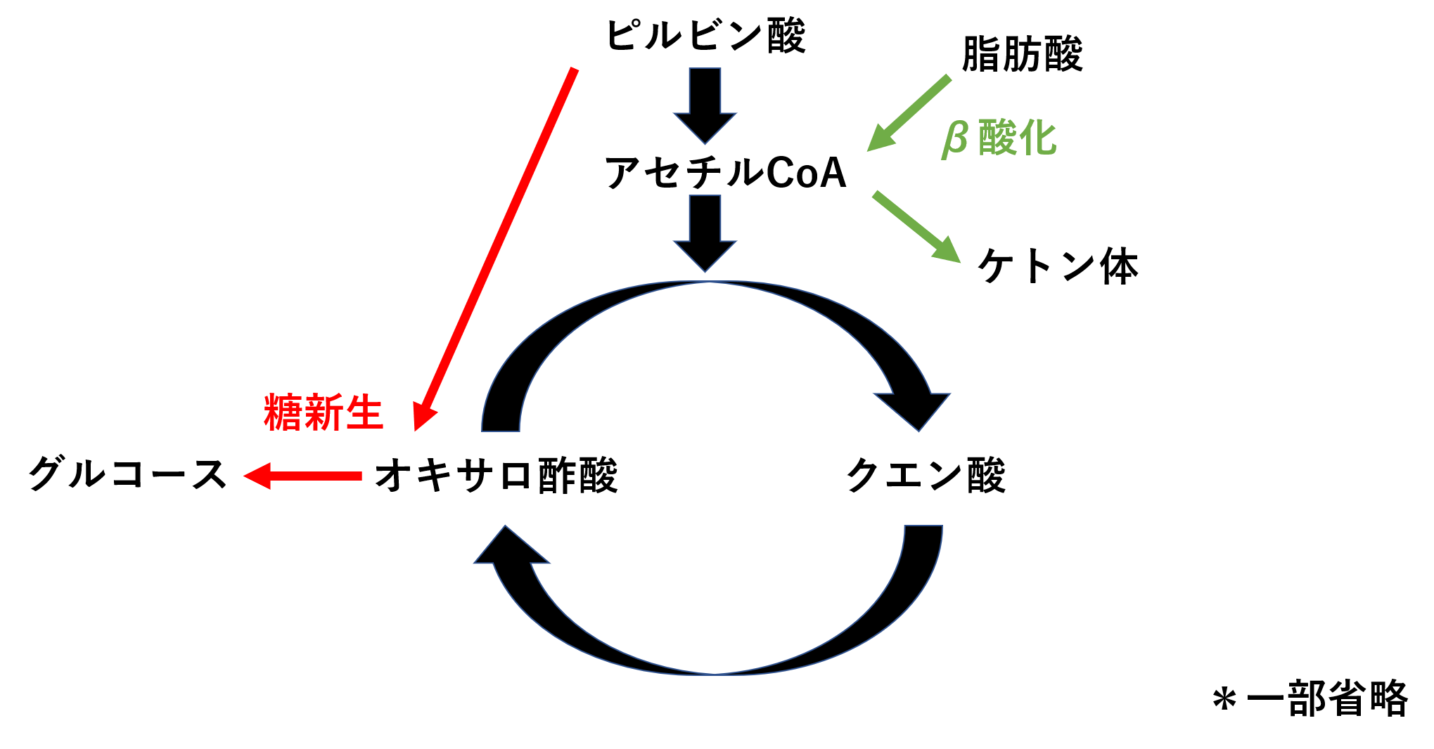 アセチルCoAは本来であれば、クエン酸回路(TCAサイクル)と呼ばれる回路を回すことに使われ、大きなエネルギーを得ることができます。しかし、クエン酸回路を回すにはアセチルCoAとオキサロ酢酸と呼ばれる2つの材料が必要です。もう一つの材料であるオキサロ酢酸は糖新生と呼ばれる別の糖を作る反応でどんどん使われてしまうため、少ない状態となってしまいます。